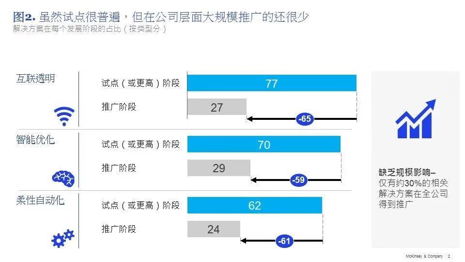 但是,仅30%的试点最终推广到了整个公司层面。换句话说,对于另外70%的试点,各企业未能成功从中提取价值(见图2)。此外,试点进程非常缓慢。约85%的受访企业表示,其停留在试点阶段的时间超过一年,28%的企业超过两年。要从这数万亿美元的价值中分一杯羹,企业必须加快试点的扩张速度。