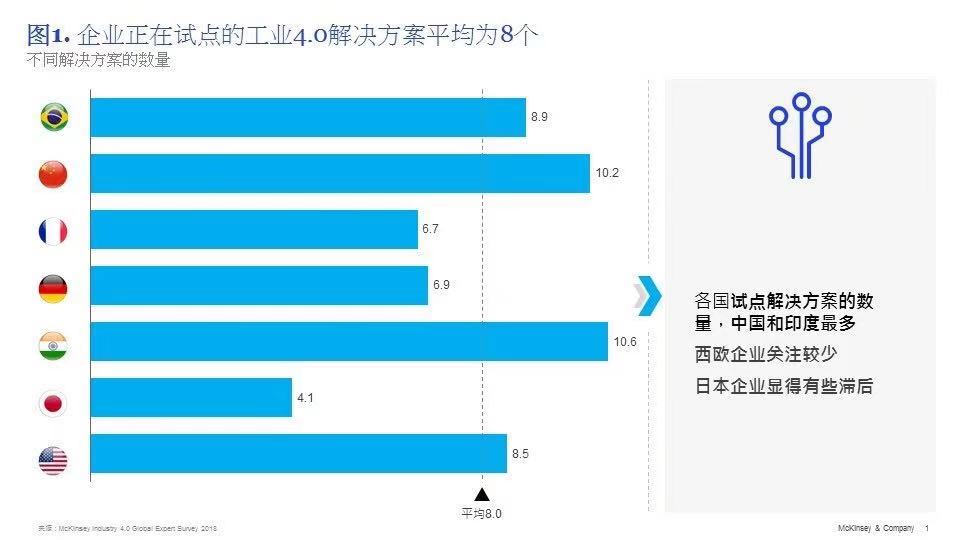 全球各大企业都希望从这几万亿美元的价值中分一杯羹,纷纷推动实施工业4.0用例。根据调查,全球公司推出的用例平均数约为8个,中国和印度公司的力度较大,平均约为10个(见图1 )。