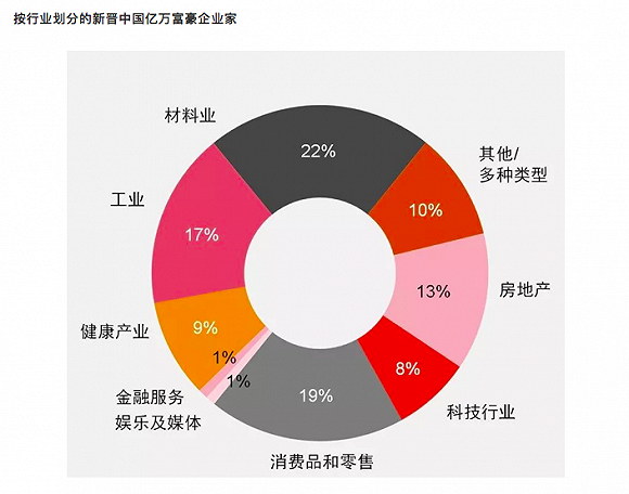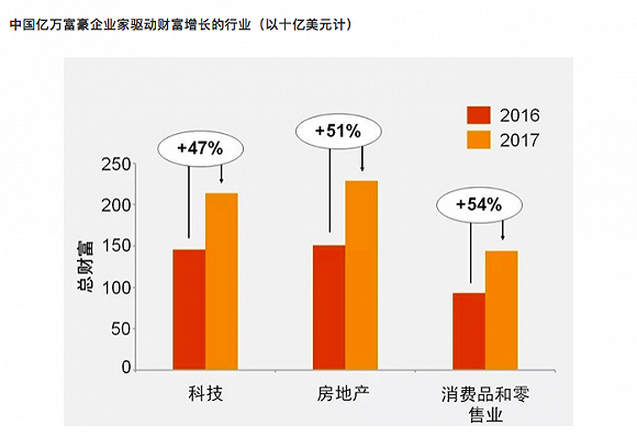 依据2017年的数据,占据这些富豪财富半壁江山的行业是房地产、科技和消费品与零售。曾经,随着城市化进程的加快,中国企业家们在房地产行业聚集财富,但是在过去10年中,他们的商业活动逐步转向互联网和电子商务,并在科技领域(如金融科技、生物技术和人工智能)中蓄势。仅2017年,中国亿万富豪的财富就增加了39%,达到了1.12万亿美元,这与中国电子商务和科技行业的爆发式发展密不可分。
