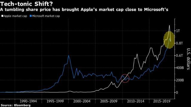 苹果市值第一的宝座坐了7年之久,在今年,苹果从首家破万亿市值的公司到市值狂跌2800多亿美元,也就短短几个月的时间。不久前苹果市值七年多来首次被微软短暂超越。当时微软的市值为8129.3亿美元,苹果紧随其后,为8126亿美元。