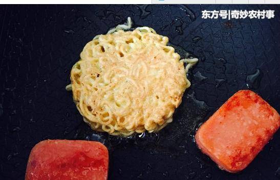 平底锅热后加大批油,用中火,将利便面放入圆形煎蛋器中与 火腿片一同煎两三分钟